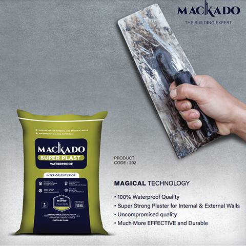 Mackado Super Plast is a premium wall plaster, premixed dry-mortar with cement-clinker, river sand, silica, plaster sand, waterproof polymers and Mackado magical binders, for internal and external wall. By selecting this product, your dream home gets a super finished and whitish primer touch wall. It is a mixture of high graded materials that are genuine and tested in our lab. With higher performance and speedier application process, it saves your money, time and efforts.